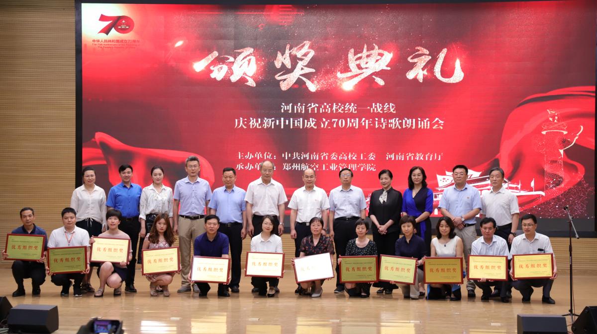 近日,中共河南省委高校工委发布《关于公布全省高校统一战线开展庆祝新中国成立70周年系列活动评选结果的通知》(豫高发〔2019〕83号),对获奖单位和个人进行表彰。综合系列活动情况,我校和郑州大学、河南大学等18 所高校领导重视、组织得力、成效显著,被授予优秀组织奖,并获得一等奖3个,二等奖2个,三等奖2个,1人入选全省高校100名优秀党外知识分子的好成绩。