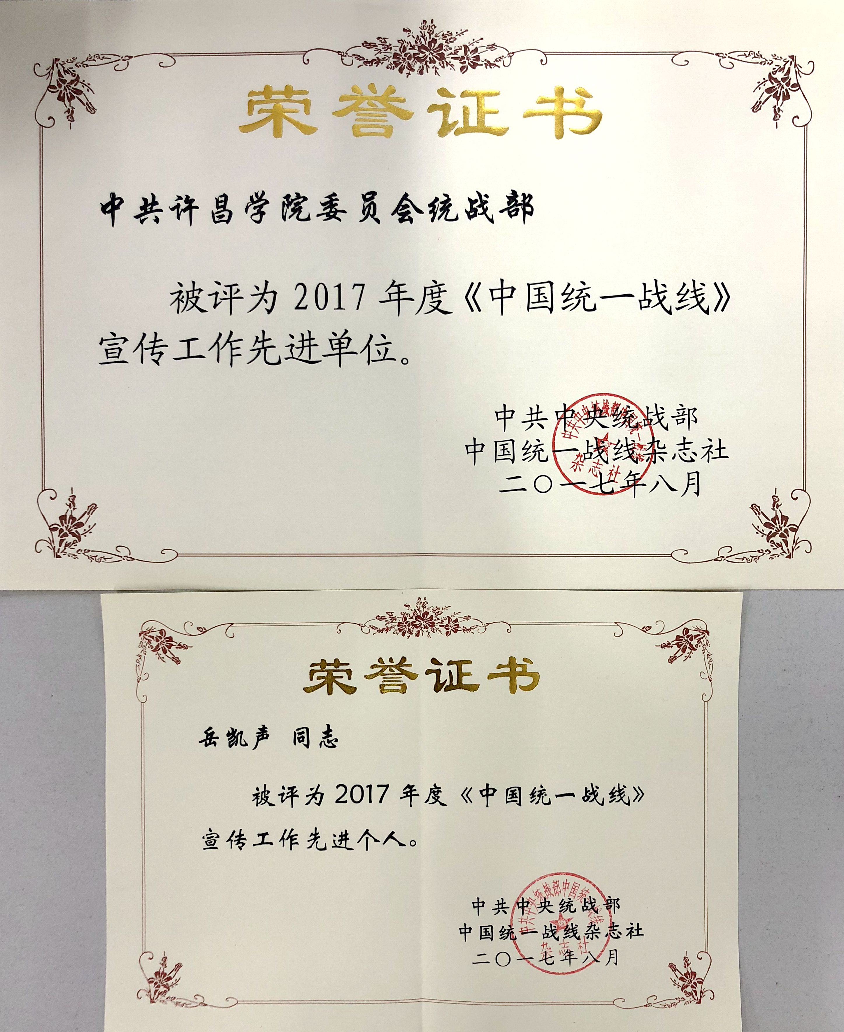 近日获悉,我校党委统战部被中共中央统战部《中国统一战线》杂志社评为2017年度宣传工作先进单位。党委统战部岳凯声老师被评为宣传工作先进个人。