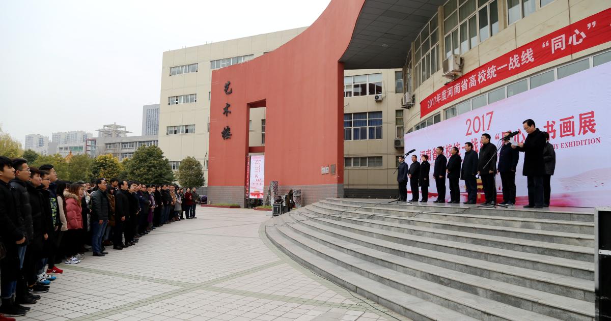 12月12日,全省高校统一战线“同心”书画展开幕式在我校艺术楼广场成功举办。省委高校工委专职委员高治军、省教育厅统战工作处处长张水潮、许昌市委统战部常务副部长闫占锋,我校党委书记闫纪建、院长赵继红,许昌职业技术学院党委书记袁海涛,许昌电气职业学院党委书记杨鲁西,我校副院长郑直、黄怡俐出席开幕式。开幕式由党委副书记马超主持。