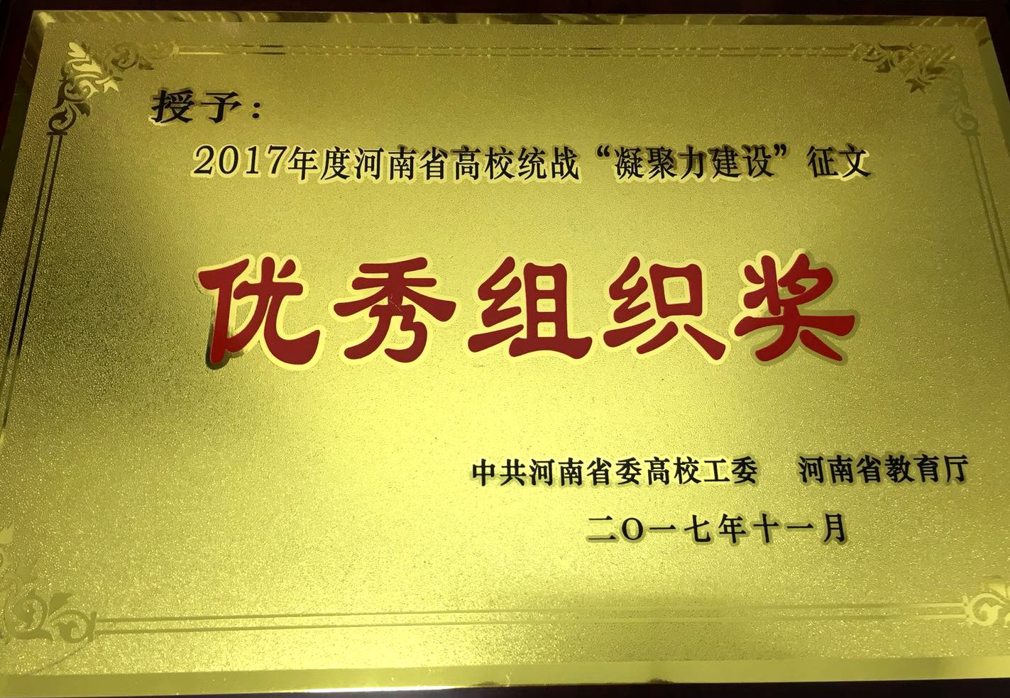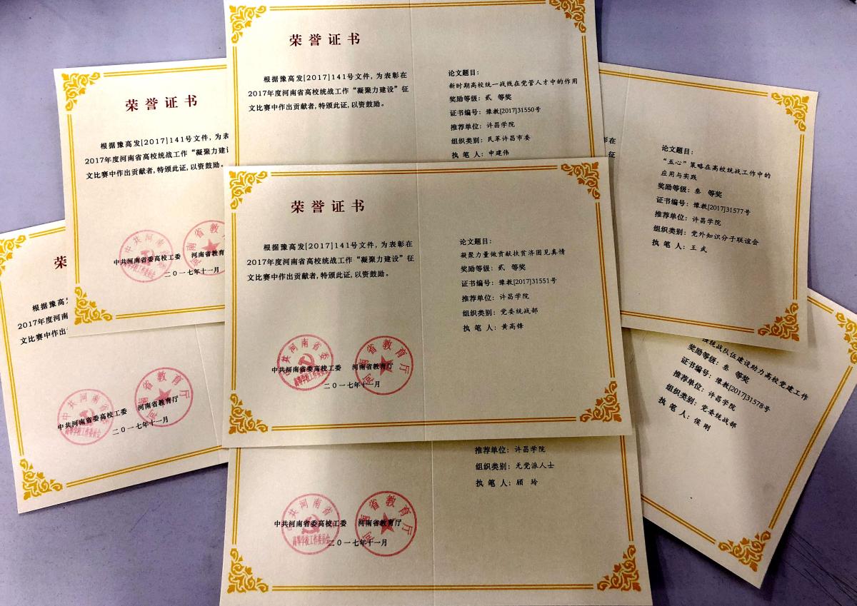 近日,中共河南省委高校工委 河南省教育厅印发《关于公布2017年度河南省高校统战工作“凝聚力建设”征文比赛活动结果的通知》(豫高发〔2017〕141号),对全省高校统战工作“凝聚力建设”征文比赛活动进行通报表彰。我校荣获优秀组织奖,7名教师的征文作品获奖。