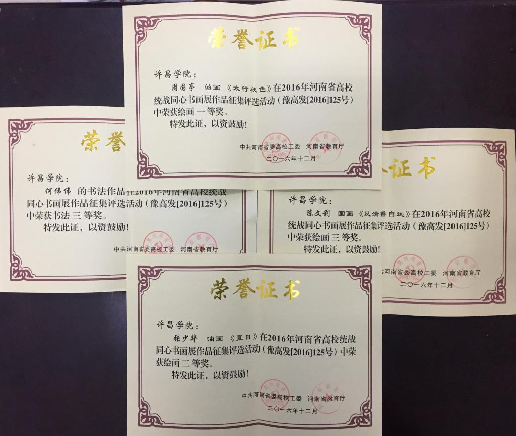 近日,中共河南省委高校工委、河南省教育厅印发《关于公布2016河南省高校统战同心书画作品评选结果的通知》(豫高发〔2016〕125号),对2016河南省高校统战同心书画作品评选结果进行通报表彰。我校选送的4名教师作品全部获奖。其中,九三学社社员、美术学院周国亭老师油画作品《太行秋色》获绘画类一等奖;九三学社社员、美术学院副院长张少华油画作品《夏日》获绘画类二等奖;无党派代表人士、美术学院院长兼工笔画研究所所长陈文利国画作品《风清香自远》获绘画类三等奖;九三学社社员、新材料与能源学院何伟伟老师书法作品获书法类三等奖。