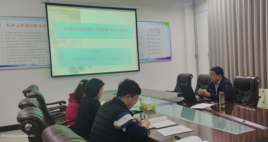 4月17日上午,党委统战部部长王彦在办公楼第二会议室以“传统文化中的人生智慧与自我管理”为主题为部门全体同志上了一堂生动深刻的专题党课。