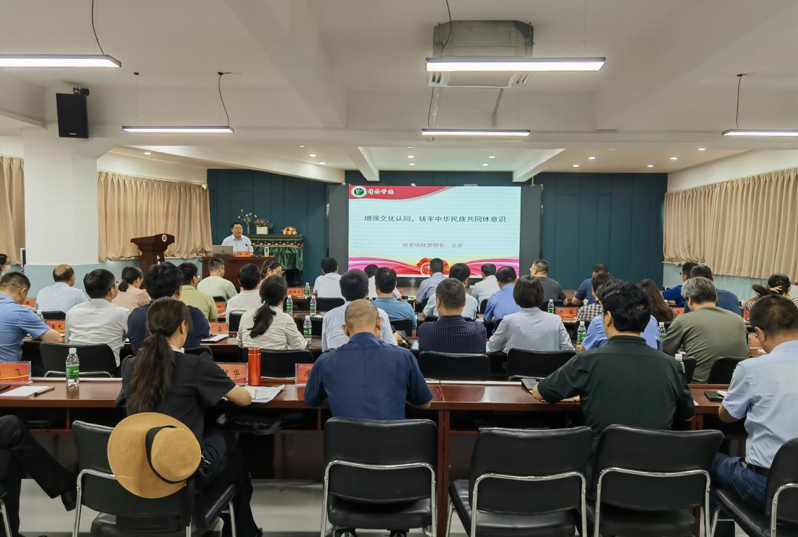 6月27日下午,我校在弘毅书院二楼会议室举行铸牢中华民族共同体意识专题培训会。党委统战部部长王彦同志作专题报告。校党委副书记孙海主持培训会,学校统战工作领导小组成员,民族宗教工作联络员,各二级学院(书院)党委副书记、辅导员代表参加培训会。