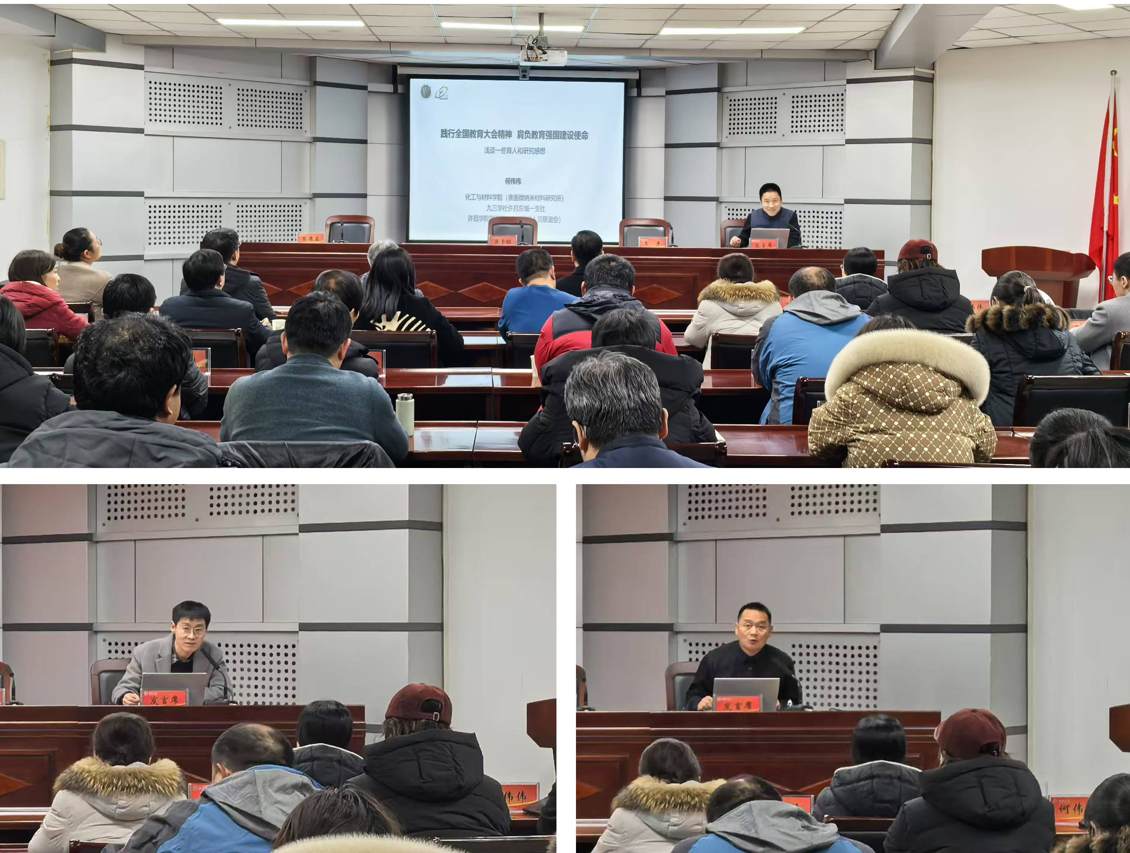 宣讲中,九三学社许昌东城一支社主委、许昌市政协常委、我校表面微纳米材料研究所所长兼化工与材料学院副院长何伟伟教授以自己的学习、从教和科研经历为切入点,畅谈在高等教育中如何培养学生科研兴趣、学术素养和创新能力的心得感悟,科研中如何不断产出高层次研究成果的经验方法。他坚持在工作中保持纯真、在教育中不忘初心、在生活中深藏勇气,引起了与会教师深深的共鸣。我校党外知识分子子联谊会副秘书长、地理与空间信息学院测绘工程系副主任易航博士围绕测绘工程专业建设和高素质应用型人才培养,从思政教育与专业学习并举、科研和社会服务同行、本科教育和职业技能培养共进等方面介绍了测绘工程专业在培养学生创新能力和服务地方经济发展的经验和举措。我校欧美同学会(留学人员联谊会)秘书长、法学院副教授尹晓兵博士从高等教育的目的、方式、意义、前景四个方面畅谈了对全国教育大会精神的学习体会,以系统论的拓朴思维结构,阐释了四个方面之间的内在联系,表达了对教育事业的热爱和思考,以及致力于学校事业高质量发展的决心和信心。
