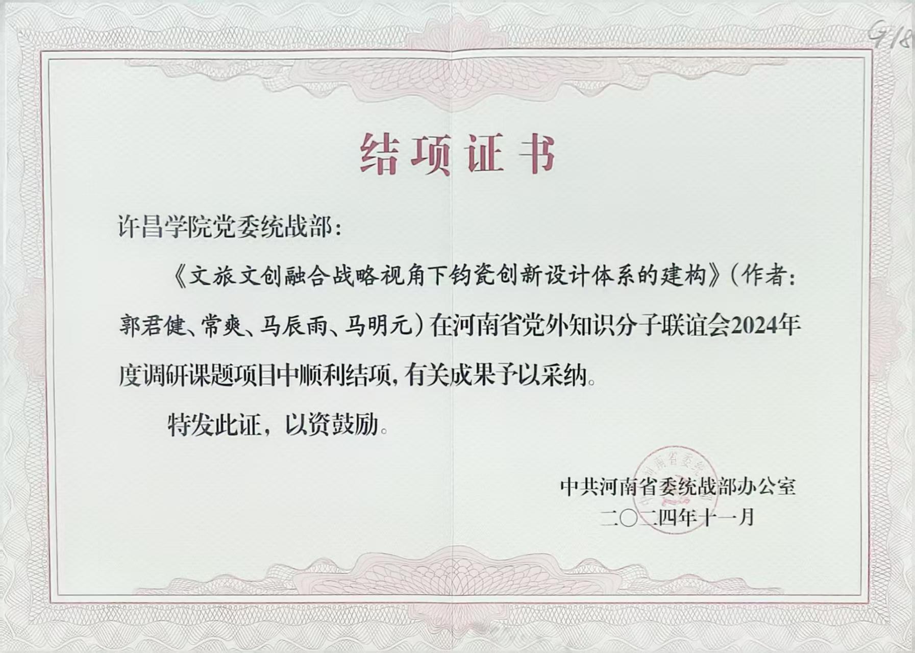 近日,省委统战部办公室下发《关于河南省党外知识分子联谊会2024年度调研课题结项的通知》,我校无党派代表人士郭君健教授主持的《文旅文创融合战略视角下钧瓷创新设计体系的建构》顺利结项,研究成果被省委统战部办公室采纳。