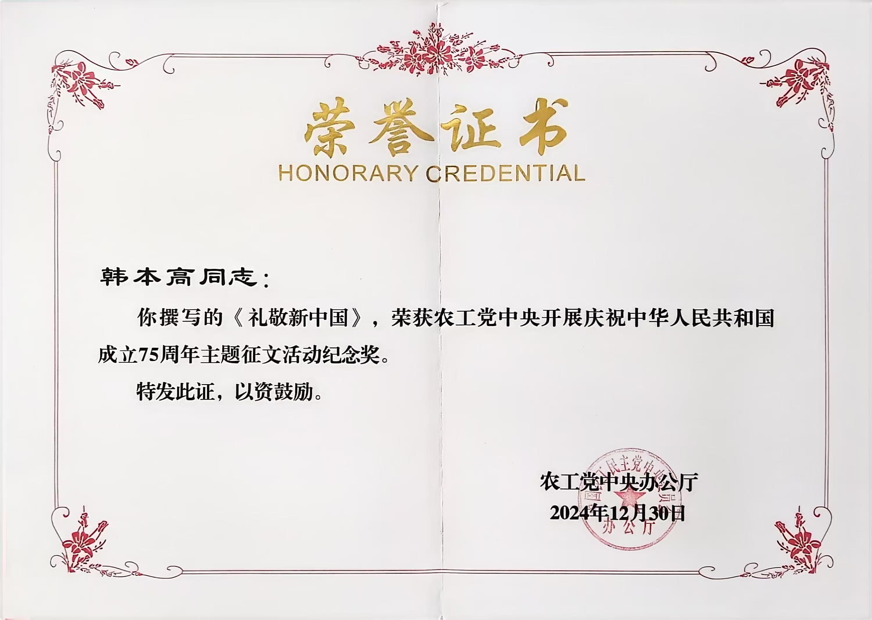 近日,农工党中央办公厅印发《关于庆祝中华人民共和国成立75周年主题征文优秀作品评选结果的通报》,农工党许昌市支部第二分支部副主委、我校博雅书院教师韩本高撰写的《礼敬新中国》荣获纪念奖。
