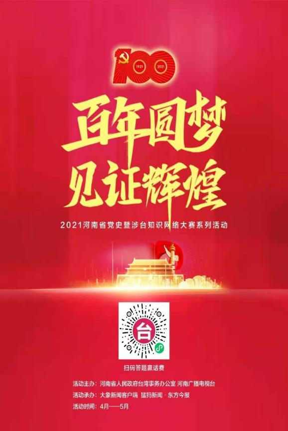 为深入贯彻落实党中央关于开展党史学习教育的安排部署和2021年中央、全省对台工作会议精神,切实引导广大干部群众学史明理、学史增信、学史崇德、学史力行,准确把握中央对台方针政策,及时了解台海局势变化,进一步增强做好对台工作的使命感和责任感,为维护国家改革发展稳定大局和早日完成祖国统一大业作出积极贡献,河南省委台湾工作办公室决定在全省开展“百年圆梦·见证辉煌”河南省党史暨涉台知识网络大赛系列活动。现就我校参加网络竞赛活动的有关要求通知如下:
