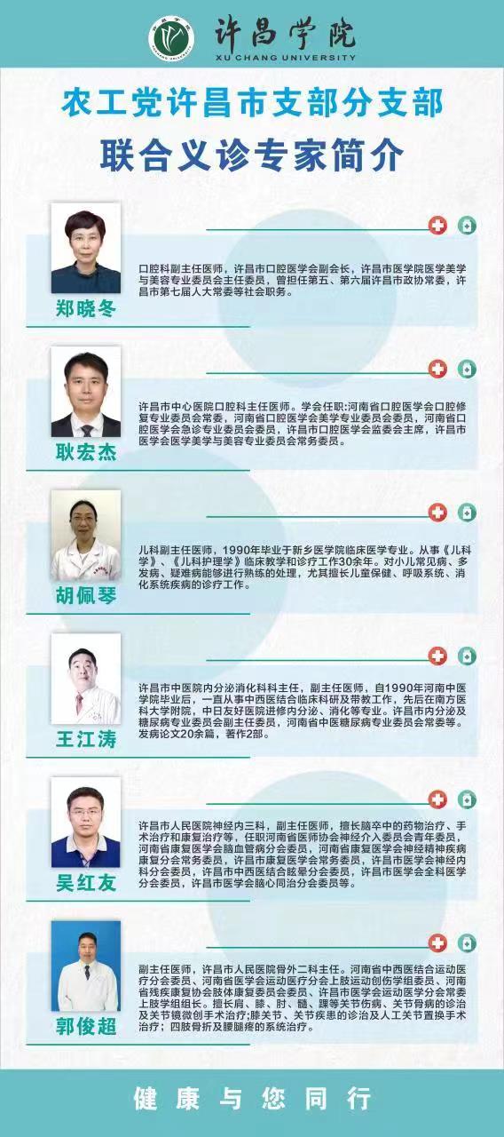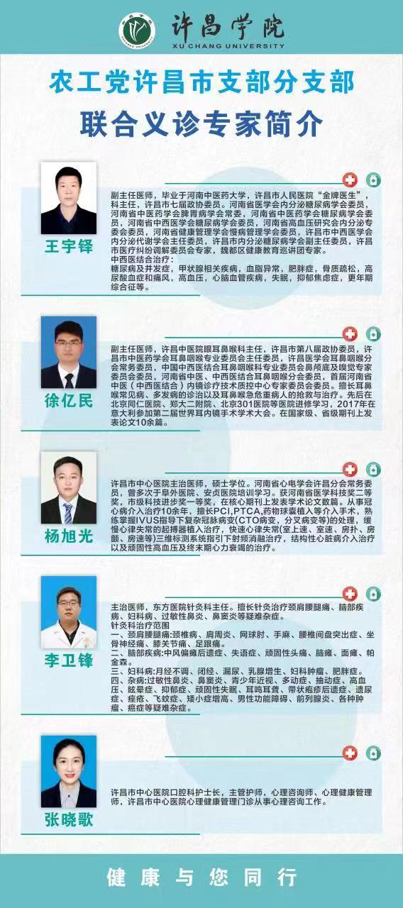 为提高我校教职工、家属和学生的医疗健康意识,养成良好的卫生习惯,农工党许昌支部邀请许昌市中心医院、人民医院、中医院的专家到我校举行“关注高校师生健康,农工党员在行动”的健康义诊活动,现就相关事宜通知如下: